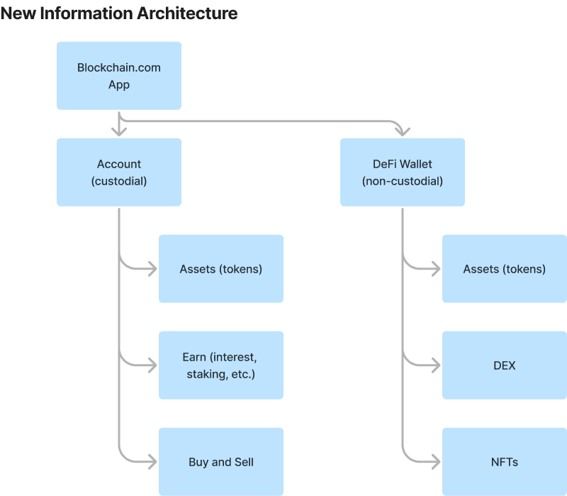 Superapp came out of a need for clarity and better information architecture. Our goal as a company was to onboard the next 100M users to crypto. Unfortunately, we used uncommon terminology, combined custodial and non-custodial wallets/features, and left the decision making up to users without giving them the information they need to make a good decision.